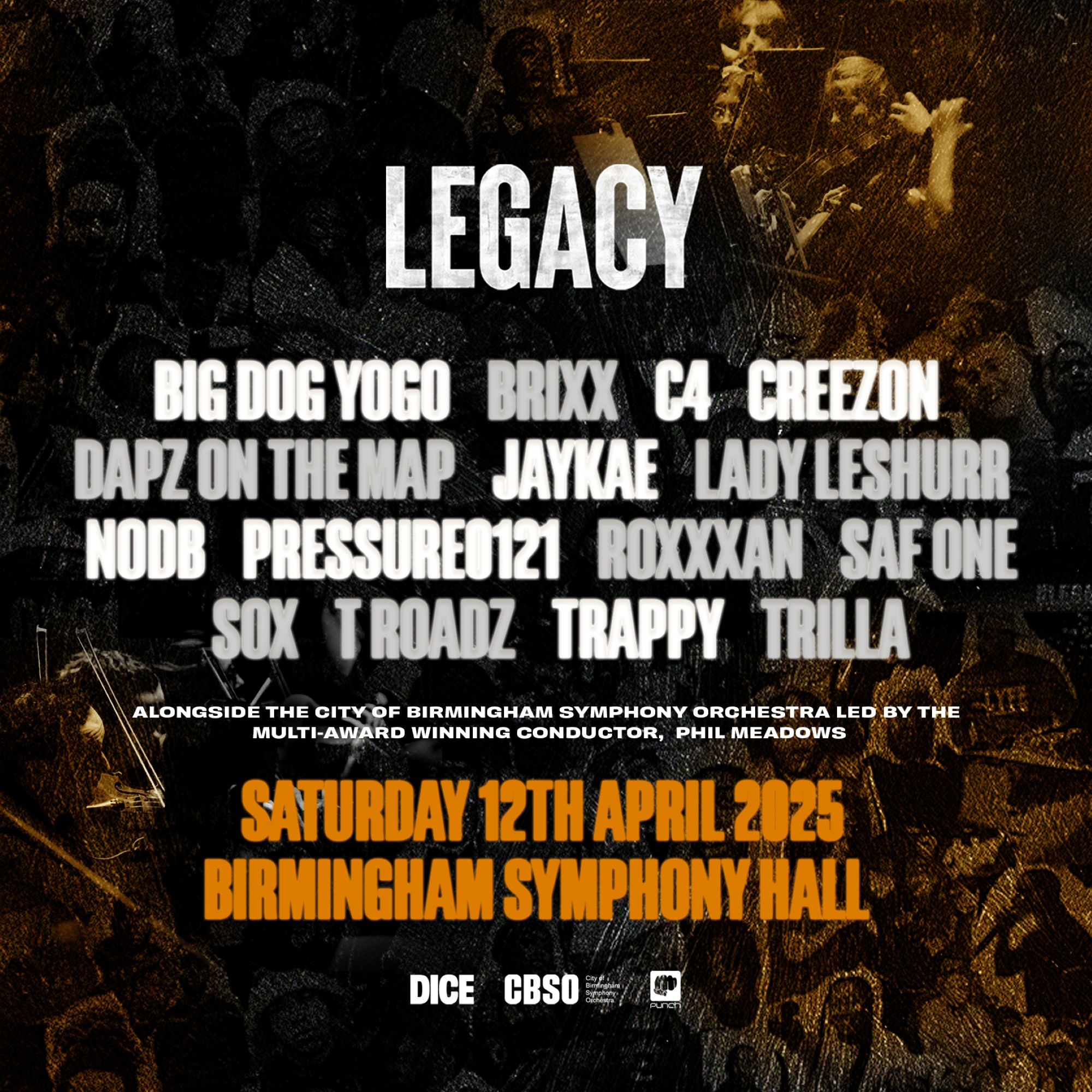 Nikki Riggon, Head of Programme & Senior Producer at Punch Records stated, “We are incredibly honoured to celebrate Birmingham’s rich Rap and Grime heritage in such an extraordinary way. LEGACY began as a documentary commissioned by Punch Records to highlight the rise of Birmingham’s rap industry and its profound impact on British music. Now, by transforming it into a live performance in collaboration with the CBSO, we’re breaking creative boundaries—showcasing the Midlands’ finest talent to new audiences while honouring the pioneers of the scene and shining a light on its vibrant future.”
